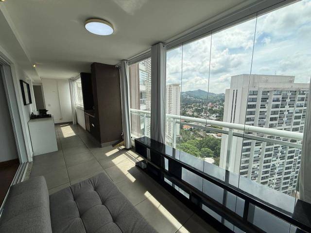 Cabeceiras em todos os quartos, criado mudo em todos os quartos, cama King no quarto de casal, mesa com cadeira na sala, sofá em L, e outro sofá na sala, todas as varandas envidraçadas.